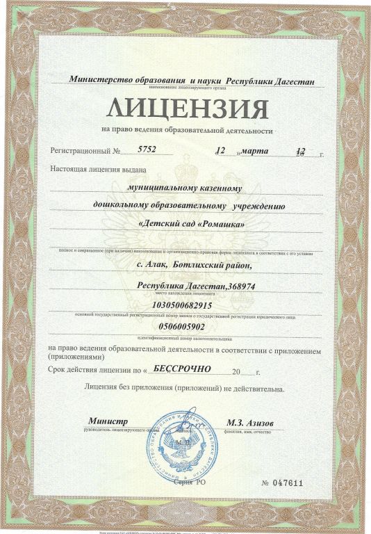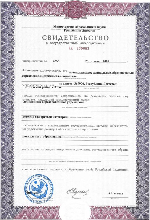 | Полное наименование образовательной организации* | Муниципальное казенное дошкольное образовательное учреждение "Детский сад "Ромашка" с.Алак муниципального района "Ботлихский район" |